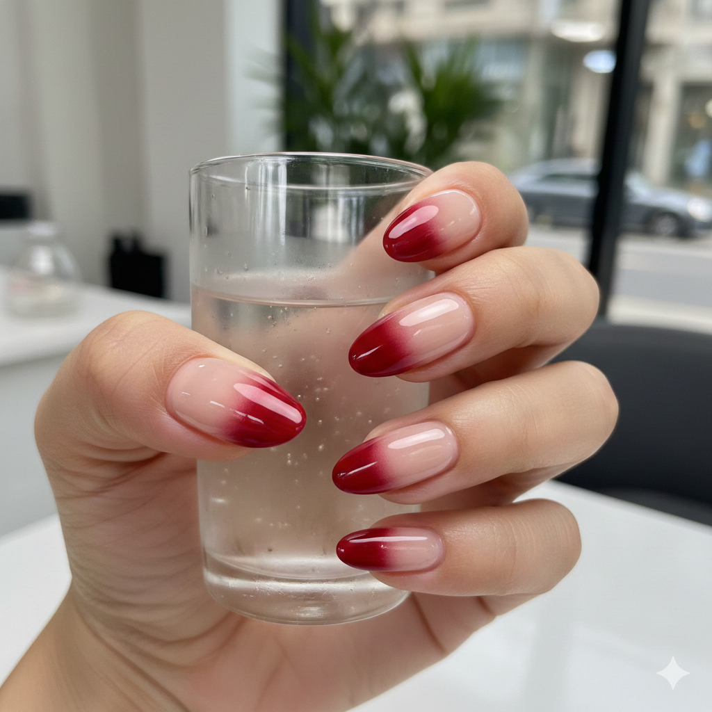 A soft fade from nude to red at the tips. It’s flattering, modern, and less harsh than full red.